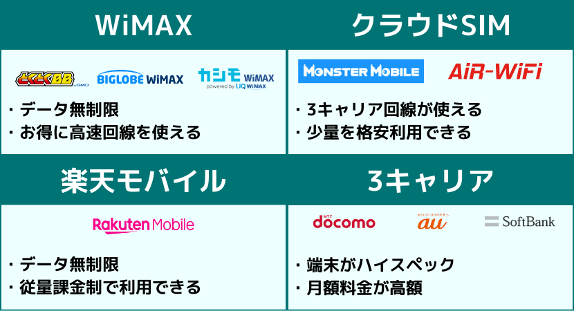 WiMAXやY!mobileなどのCMでおなじみのサービスの他にも、NTTdocomo・ソフトバンク、auといった大手キャリア、モンスターモバイルをはじめとするクラウドSIM系のWi-Fiなど、種類もさまざま。