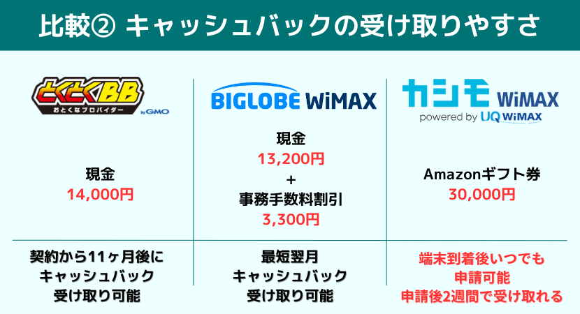 しかし、キャッシュバックキャンペーンを選ぶ際は、ただ金額が高額であれば良いわけではありません。WiMAXプロバイダによってキャッシュバックやその他キャンペーンの受け取り方や受け取り時期が異なり、中には「1年後に申請すれば受け取れる」といった受け取り忘れる可能性が高いものも存在。