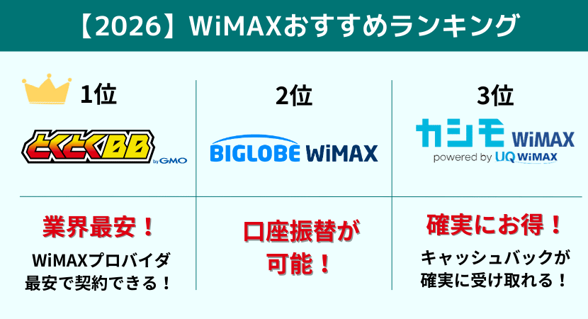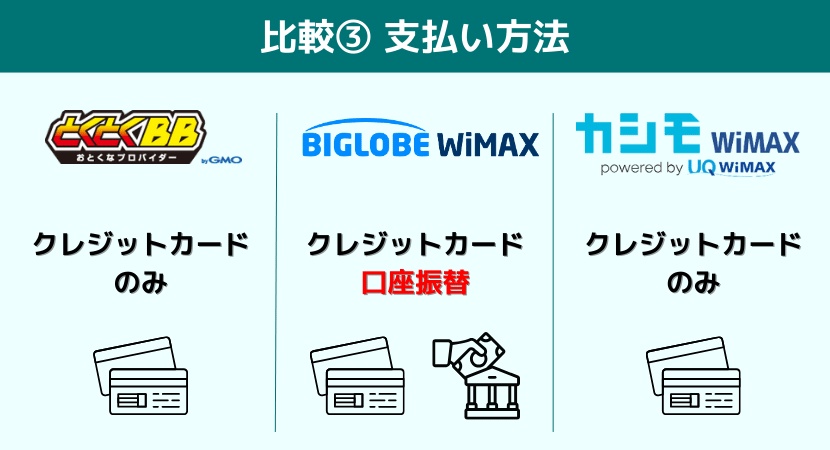 一方で、GMOとくとくBB WiMAXは口座振替支払いができないため、月々の料金を口座振替で支払いたい方は、BIGLOBE WiMAXがおすすめです。